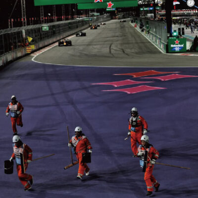 在剛過去的拉斯維加斯站,有工作人員於T1緩衝區清理碎片,期間車群高速經過該路段。